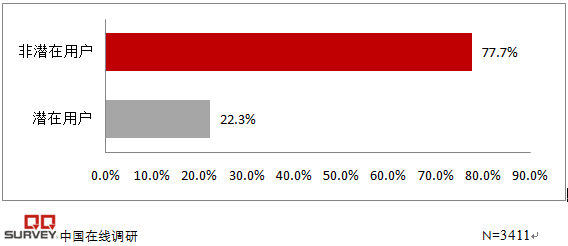 QQSurvey中國(guó)在線調(diào)研2016Q2智能手機(jī)調(diào)查是基于對(duì)中國(guó)3411位網(wǎng)民進(jìn)行“預(yù)期未來三個(gè)月內(nèi)(2016年4月-2016年6月底)是否會(huì)購(gòu)買智能手機(jī)”,其中有22.3%的消費(fèi)者愿意未來三個(gè)月內(nèi)購(gòu)買智能手機(jī),我們稱之為潛在消費(fèi)者;77.7%的網(wǎng)民沒有意向在未來三個(gè)月內(nèi)購(gòu)買智能手機(jī),我們稱之為非潛在的消費(fèi)者。