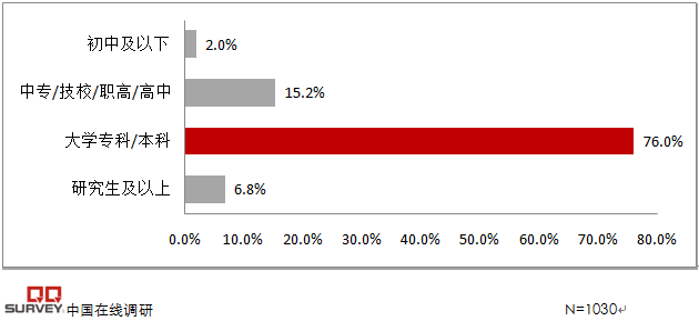 QQSurvey中國(guó)在線調(diào)研2016Q2智能手機(jī)調(diào)查是基于對(duì)中國(guó)1030位“未來三個(gè)月內(nèi)會(huì)購(gòu)買智能手機(jī)”的網(wǎng)民進(jìn)行的調(diào)研。在這1030位智能手機(jī)潛在使用者中,學(xué)歷為大學(xué)???/span>/本科的占據(jù)76.0%,成為最主要的消費(fèi)群體。學(xué)歷在高中及其以下的占據(jù)了17.2%。而擁有研究生及以上的被訪者則占據(jù)了6.8%。整體來看,智能手機(jī)潛在消費(fèi)者學(xué)歷主要集中為大學(xué)???/span>/本科。