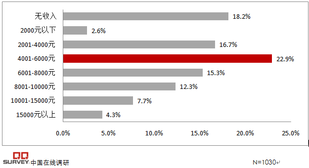 QQSurvey中國(guó)在線調(diào)研數(shù)據(jù)顯示,參與調(diào)查的1030位智能手機(jī)潛在消費(fèi)者可支配個(gè)人月收入集中在2000-15000元,累計(jì)占比超過七成。其中個(gè)人月收入在4001-6000元的潛在消費(fèi)者占了22.9%,成為最主要的消費(fèi)群體。其次是2001-4000元,占16.7%,而沒有收入的用戶則以學(xué)生居多,他們對(duì)流行趨勢(shì)較為敏感,占到了18.2%的比例。