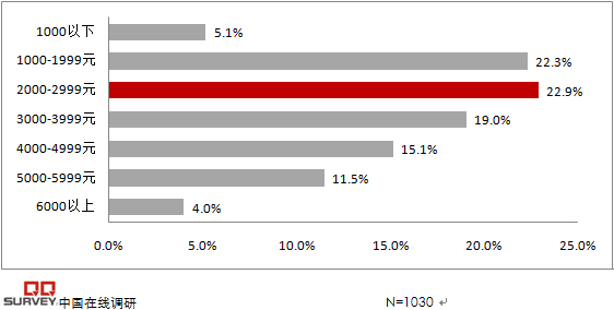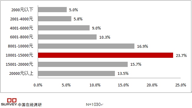 QQSurvey中國(guó)在線調(diào)研數(shù)據(jù)顯示,參與調(diào)查的1030位智能手機(jī)潛在消費(fèi)者可支配家庭月收入集中在4000元以上,累計(jì)占比超過八成。而其中家庭月收入在10001-15000元的潛在消費(fèi)者占了23.7%,成為最主要的消費(fèi)群體。