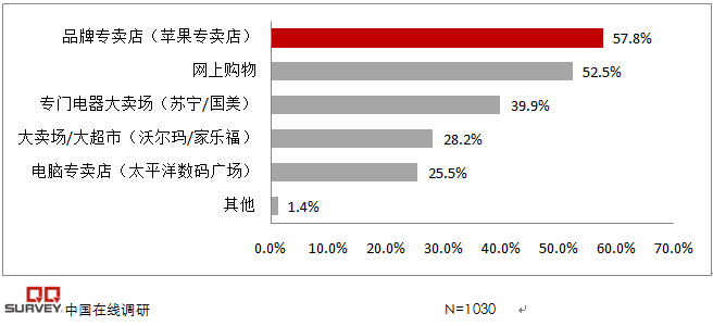 QQSurvey中國(guó)在線調(diào)研數(shù)據(jù)顯示,參與調(diào)查的1030位智能手機(jī)潛在消費(fèi)者在購(gòu)買智能手機(jī)時(shí)的主要渠道是品牌專賣店,所占比例為57.8%,其次是網(wǎng)上購(gòu)買和專門電器大賣場(chǎng),所占比例分別為52.5%、39.9%,大賣場(chǎng)/大超市和電腦專賣店緊追其后,分別占據(jù)28.2%、25.5%。