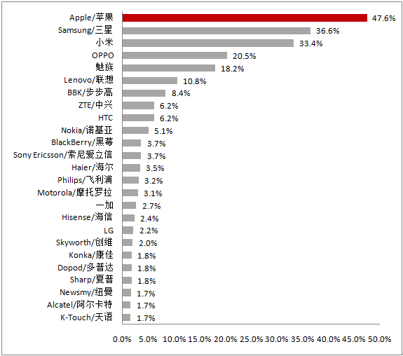 智能手機(jī)潛在消費(fèi)者中針對(duì)“預(yù)期購(gòu)買哪些品牌”方面,蘋果(Apple)、三星(Samsung)和小米占主導(dǎo)地位,分別占了47.6%、36.6%和33.4%比例。其次是OPPO、魅族、聯(lián)想,分別占了20.5%、18.2%、10.8%。其他品牌的購(gòu)買意向都低于百分之十,由此可以看出在消費(fèi)者心目中蘋果(Apple)、三星(Samsung)和小米還是占據(jù)絕對(duì)主導(dǎo)地位。