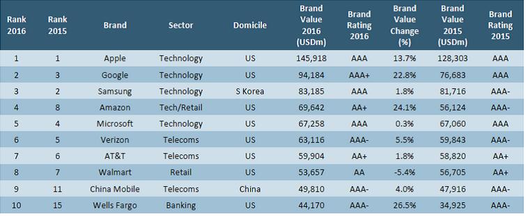 雖然收入增長(zhǎng)放緩,Apple仍然是全球最有價(jià)值的品牌,市值增長(zhǎng)14%,達(dá)到1459億美元;