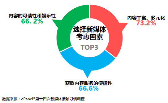 網(wǎng)民使用新媒體時(shí)重點(diǎn)考量其所承載的內(nèi)容和獲取的便捷性。網(wǎng)民首選內(nèi)容的豐富多元化,選擇率為73.2%,此外,獲取內(nèi)容的便捷性和內(nèi)容的可讀性、娛樂性也是網(wǎng)民重要的考慮因素。