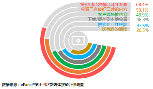 ? 電視臺(tái)熱播劇及節(jié)目仍然是用戶首選的收看內(nèi)容。在收看視頻的習(xí)慣中,68.4%的用戶習(xí)慣通過搜索引擎或?qū)I(yè)的視頻網(wǎng)絡(luò)/客戶端搜索當(dāng)前電視臺(tái)熱播的電視劇、節(jié)目或院線熱映電影;接近6成的用戶還是會(huì)看重視頻內(nèi)容的口碑情況,會(huì)在專業(yè)的視頻網(wǎng)站/客戶端進(jìn)行追看良好口碑的內(nèi)容;另有接近5成的用戶選擇觀看視頻網(wǎng)站/客戶端熱推的內(nèi)容;此外,下載/緩存到本地觀看和專業(yè)性視頻的收看習(xí)慣的比例也均在45.0%以上。