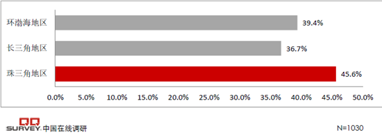 參與調查的珠三角地區(qū)(含廣州、深圳、東莞、惠州、中山、珠海及周邊等城市)、長三角地區(qū)(含上海、杭州、南京、蘇州、無錫、揚州、溫州、義烏及周邊等城市)、環(huán)渤海地區(qū)(含北京、煙臺、天津、大連、威海、青島等城市)的網購消費者們預期在2016Q3網購消費金額均有所變化。其中珠三角地區(qū)網購消費者的網購前景最為樂觀,網購消費者的凈網購預期前景指數(shù)達+45.6%。環(huán)渤海地區(qū)的網購消費者的凈網購前景緊追珠三角地區(qū),網購消費者的凈網購前景指數(shù)達到+39.4%。長三角地區(qū)的網購消費者的凈網購前景指數(shù)為+36.7%。