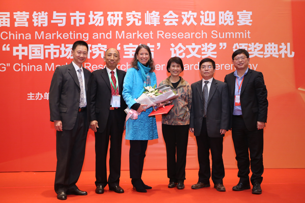 在本屆寶潔論文獎(jiǎng)?lì)C獎(jiǎng)典禮上,CMRA為了表彰寶潔獎(jiǎng)創(chuàng)始人之一、現(xiàn)任寶潔公司全球副總裁Ms.Berenike(吳凱女士),特別為她頒發(fā)了“CMRA杰出貢獻(xiàn)獎(jiǎng)”,以感謝她為中國(guó)市場(chǎng)研究行業(yè)做出的貢獻(xiàn)。國(guó)家統(tǒng)計(jì)局劉恒司長(zhǎng)、華通明略董事長(zhǎng)高余先先生、致聯(lián)市場(chǎng)研究董事長(zhǎng)吳鋼民先生為吳凱女士頒發(fā)了獎(jiǎng)杯、證書和鮮花。