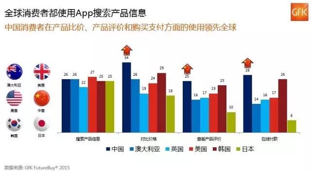 隨著在線市場對線下傳統(tǒng)渠道的不斷滲透和影響,消費者的購物場景也在悄悄發(fā)生著變化,利用手機(jī)對產(chǎn)品進(jìn)行比價、評論、支付、分享已經(jīng)成為了當(dāng)下最流行的生活方式。根據(jù)捷孚凱(GfK全球)《2015年FutureBuy全球消費者調(diào)研報告》顯示,中國消費者在產(chǎn)品比價、產(chǎn)品評價和在線支付方面的使用領(lǐng)先全球??梢哉f,智能手機(jī)和移動互聯(lián)近幾年來在中國的高速發(fā)展,進(jìn)一步加劇了中國消費者的對新興渠道的接受程度和購買意愿。