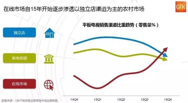 以2015年為例,在雙11、雙12的促銷的帶動下,2015年4季度,在線市場比重高達(dá)34.3%,較去年同期上漲近14.4個百分點。與之形成相反態(tài)勢的是,以往物流配送不方便,以獨立店渠道銷售為主的農(nóng)村市場,正受到在線市場滲透的影響,比重大幅下跌,在線市場首次形成了與農(nóng)村市場分庭抗禮的局面。可以預(yù)見的是,伴隨著以京東,阿里,蘇寧等為代表的農(nóng)村電商的不斷發(fā)展這一趨勢畢將持續(xù)發(fā)酵,逐步從以家電連鎖渠道為主的大中城市市場,向以獨立店渠道為主的農(nóng)村市場蔓延。