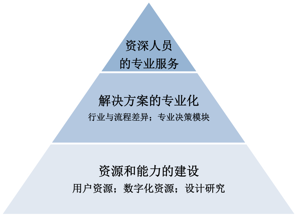 對(duì)于品創(chuàng)的業(yè)務(wù)增長(zhǎng)戰(zhàn)略,張弛歸之為三個(gè)層面,最基礎(chǔ)的層面是公司層面的資源和能力的建設(shè),中間為業(yè)務(wù)層面的解決方案的專(zhuān)業(yè)化,塔尖為資深人員的專(zhuān)業(yè)服務(wù)。