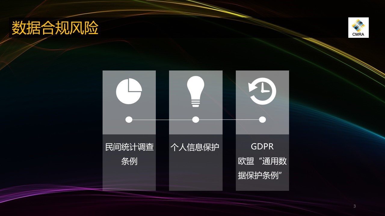 大家上午好!我們今天從強(qiáng)化業(yè)務(wù)風(fēng)險(xiǎn)管控的角度進(jìn)行分享和交流。實(shí)際上是從兩個(gè)維度來分享,我所講的主要方向是站在CMRA權(quán)益保障工作委員會角度,看過去幾年的數(shù)據(jù)采集過程當(dāng)中的風(fēng)險(xiǎn)管控。這個(gè)問題也是大多數(shù)CMRA會員給協(xié)會提的諸多的需求點(diǎn)之中的一個(gè)要求。