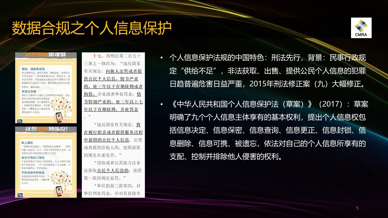 二是個(gè)人信息保護(hù)。這個(gè)是特別熱門的議題,也是跟我們每個(gè)人緊密相關(guān)的。這方面大家都知道過去幾年出了很多熱點(diǎn)事件,也是公眾輿情的敏感點(diǎn)。這方面中國特色是刑法先行,大家知道刑法是最嚴(yán)的法,通常是民事法在前面,一類一類違反了然后再違反刑法。中國是反過來,因?yàn)閭€(gè)人信息保護(hù)在過去幾年中實(shí)在是問題太大了,導(dǎo)致國家相關(guān)部門認(rèn)為,在短時(shí)間內(nèi)民法這個(gè)管理規(guī)則供給不足的情況下,例如目前個(gè)人信息保護(hù)法還沒有出來,只有草案,所以先通過刑法修正案去矯枉過正,原來刑法中泄露個(gè)人信息是針對國家公務(wù)人員借職務(wù)便利,現(xiàn)在不是,現(xiàn)在是所有機(jī)構(gòu),只要你非法獲取、持有相關(guān)的個(gè)人信息,那你都是違法,而且是違反刑法,入刑幾年都有明確規(guī)定。我們在座的很多從事數(shù)據(jù)采集的公司都要注意,例如經(jīng)常碰到客戶需要找到特定用戶來訪問,受訪者名單怎么找?從哪里找?用什么手段找?找到以后通過什么手段保管這些名單?在座各位一定要看看刑法修正案,大家一定不要為了生意鋌而走險(xiǎn)。