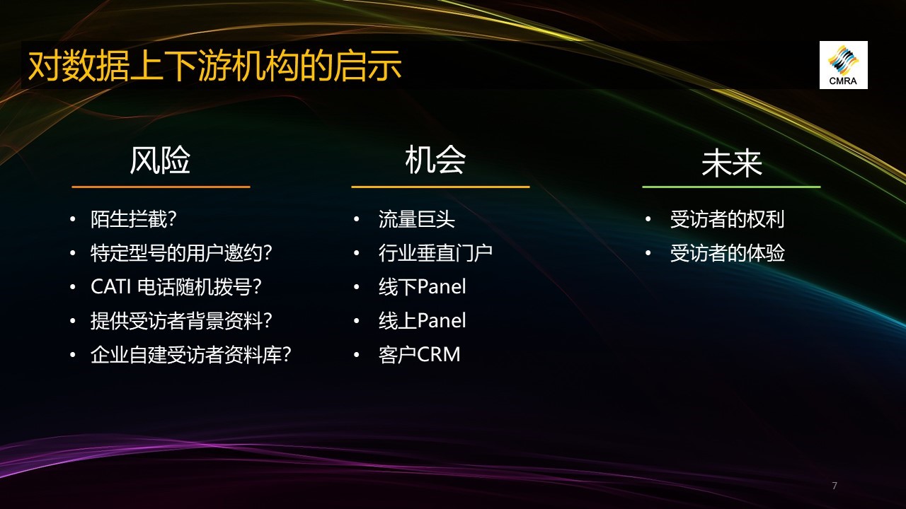 最后分享下這些風(fēng)險(xiǎn)以及相關(guān)控制工作對于數(shù)據(jù)上下游機(jī)構(gòu)的啟示。從風(fēng)險(xiǎn)角度看,我們的數(shù)據(jù)采集業(yè)務(wù),一是陌生攔截會越來越困難,一方面陌生環(huán)境下人和人的信任程度很低,另一方面也很難保護(hù)好受訪者的信息權(quán)利,例如反悔權(quán)。二是特定型號的用戶邀約也越來越困難,這種超低滲透率用戶是無法通過隨機(jī)甄選接觸到的,傳統(tǒng)上很多獲取特定型號用戶名單的方式都有很大風(fēng)險(xiǎn)。今天我想強(qiáng)調(diào)的是,對于甲方來說,你提出特定型號用戶這個(gè)條件,就意味著你的數(shù)據(jù)采集過程存在違法的風(fēng)險(xiǎn),不要認(rèn)為這個(gè)風(fēng)險(xiǎn)被隔離在了調(diào)研公司或者代理公司。這個(gè)風(fēng)險(xiǎn)我們協(xié)會也會正式出面提醒甲方注意,大家都是想把本職工作做好,有什么必要承擔(dān)不必要的法律風(fēng)險(xiǎn)呢?
