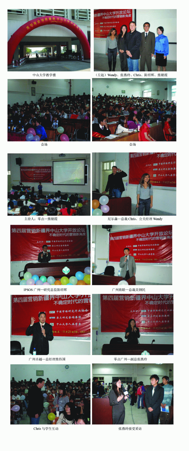 “第四屆營銷新疆界開放論壇”于2008年11月21日在廣州中山大學(xué)珠海校區(qū)完滿落幕,論壇吸引了300多名中大的師生參加。此次論壇由零點(diǎn)公司副總熊朝霞主持,尼爾森大中華區(qū)總經(jīng)理Chris、零點(diǎn)廣州分公司副總張燕玲、IPSOS廣州公司研究總監(jiān)陳紹輝、廣州致聯(lián)總裁吳鋼民、廣州卓越公司總經(jīng)理熊偉國分別發(fā)表演講。