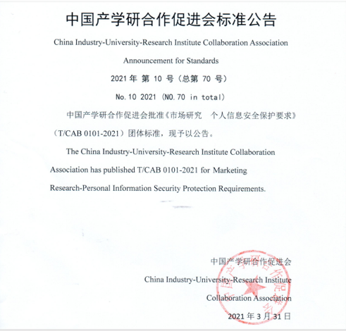 經(jīng)過一年的籌劃、研究、制定、意見征求和修改,CMRA團(tuán)體標(biāo)準(zhǔn)《市場研究 個(gè)人信息安全保護(hù)要求》于近期對社會正式發(fā)布,中國產(chǎn)學(xué)研合作促進(jìn)會已批準(zhǔn)該標(biāo)準(zhǔn)自2021年4月1日起發(fā)布實(shí)施,標(biāo)準(zhǔn)編號:T/CAB 0101-2021。目前該標(biāo)準(zhǔn)發(fā)布詳情已公示在全國團(tuán)體標(biāo)準(zhǔn)信息平臺。公示鏈接見:http://www.ttbz.org.cn/StandardManage/Detail/45049/。